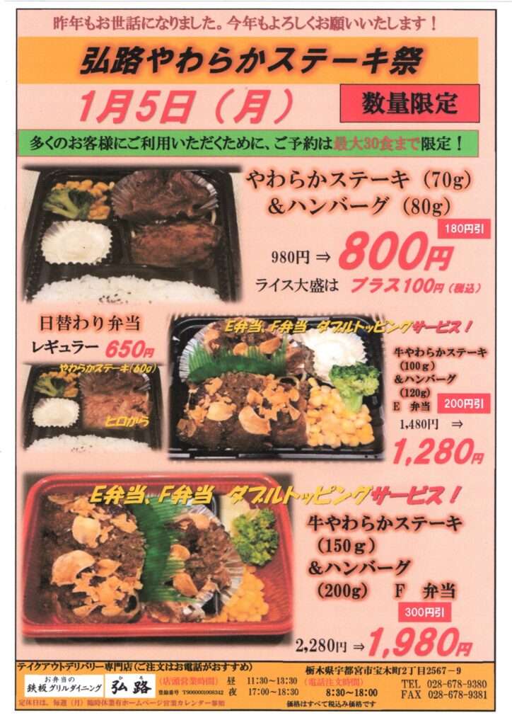 1月5日は月曜日ですが弘路も仕事初めです。その日に合わせステーキ祭を開催いたします。