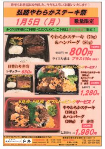 1月5日は月曜日ですが弘路も仕事初めです。その日に合わせステーキ祭を開催いたします。 ご予約お待ちしております。…