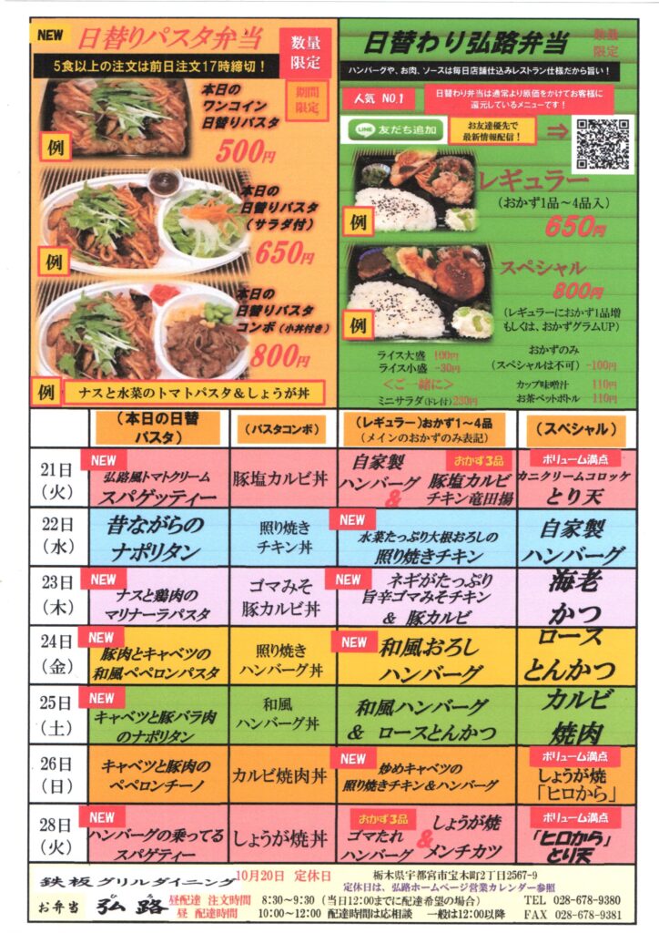 今週の日替わり弁当メニューです。ご予約お待ちしております。